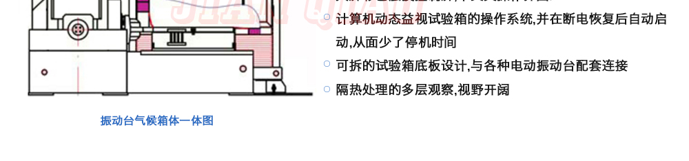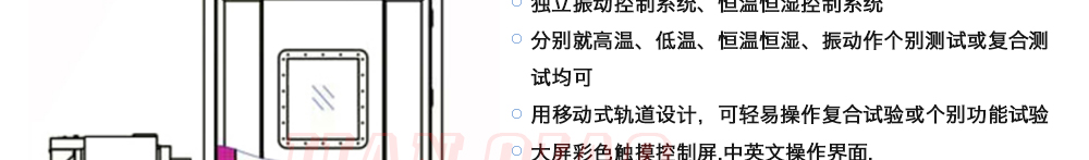 用途:三綜合環(huán)境試驗(yàn)箱主要是試驗(yàn)箱和振動(dòng)試驗(yàn)系統(tǒng)的綜合,試驗(yàn)時(shí)將溫度、濕度、振動(dòng)(高溫或低溫),(正弦振動(dòng)或隨機(jī)振動(dòng))以及電應(yīng)力按規(guī)定的周期綜合在同一氣候試驗(yàn)箱中施加到