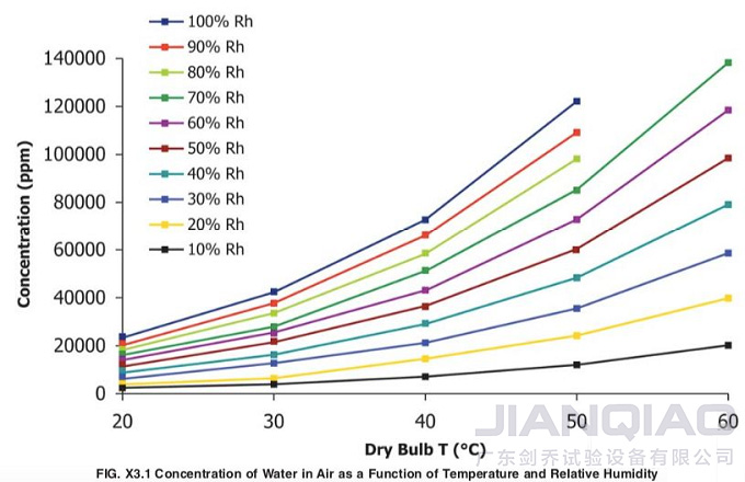 附錄X3中,表3.1是恒定水蒸氣含量下,相對濕度與溫度的關(guān)系。而圖3.1是水蒸氣含量、溫度、相對濕度三者之間的關(guān)系。在考慮了相對濕度對產(chǎn)品材料的損傷性后,大家可以針對一定溫度建立適宜的相對濕度范圍,進(jìn)而調(diào)整試驗(yàn)條件。