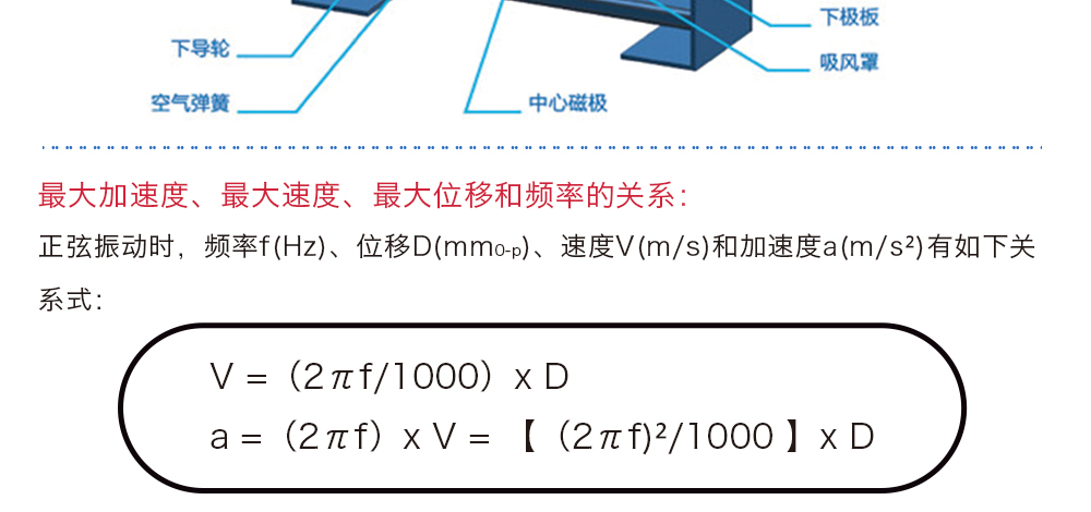 用途:正弦振動時,頻率f(Hz)、位移D(mm0-p)、速度V(m/s)和加速度a(m/s2)有如下關系式: